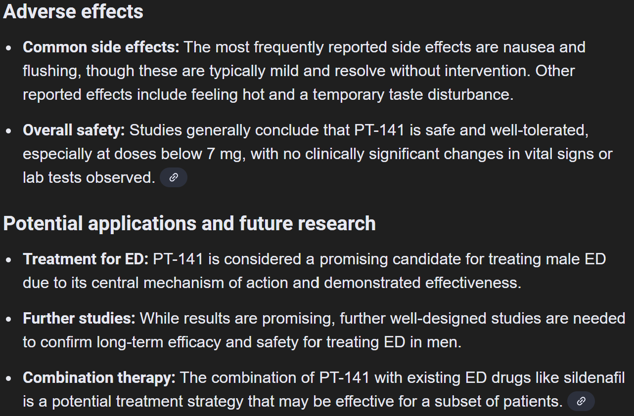 PT-141 is a melanocortin receptor agonist studied for sexual-function signaling through central pathways. Research explores its effects independent of nitric-oxide vasodilation, focusing on CNS mechanisms. It is evaluated for timing, route, and dose-response characteristics in controlled settings. Models also examine interactions with stress and fatigue. For research use only. Not approved for human consumption.
